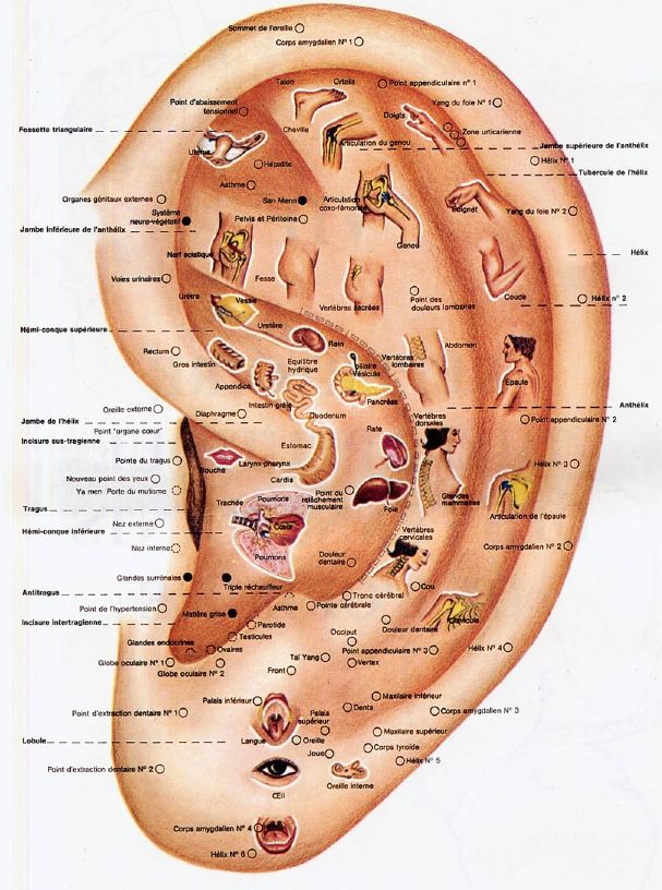 Le pavillon de l’oreille est un tableau de bord du corps humain. En effet, il existe au niveau de l’oreille une projection de points correspondants à différentes zones du corps. Cette cartographie, aussi appelée « somatotopie auriculaire » est aujourd’hui bien connue. Elle est très ancienne et a été redécouverte et développée en 1951 par le docteur lyonnais : Paul François Marie NOGIER qui a mis en lumière une cartographie du pavillon auriculaire représentant le fœtus. En 1987, l’Auriculothérapie est une pratique officiellement reconnue par l’O.M.S. et en 1990, un groupe de travail réuni par l’OMS a standardisé la nomenclature de 43 points auriculaires. Depuis, cette technique est enseignée dans de nombreuses facultés.